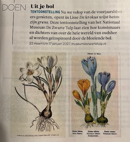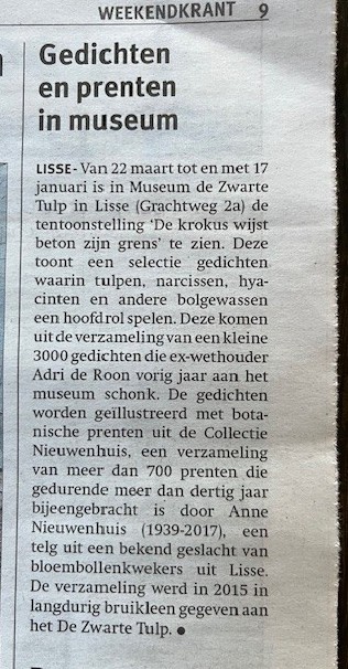 Nationaal Museum De Zwarte Tulp heeft van 21 maart 2026 tot en met 17 januari 2027 een tentoonstelling over Prenten en Gedichten, met als titel ‘De krokus wijst beton zijn grens’. De tentoonstelling is gemaakt door de Lissese kunstenares Trude Hol.